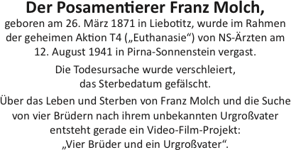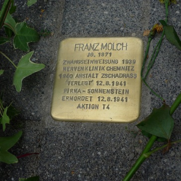 Es war im Jahr 1982, als ich das erste Mal über die Geschichte meines Urgroßvaters, Franz Molch, gestolpert bin. Ich war zur Nationalen Volksarmee eingezogen worden, als Soldat einer Pioniereinheit im sächsischen Pirna. In der Kaserne hörte ich von älteren Kameraden vom Sonnenstein, als Ort, wo es prima Kneipen geben sollte.