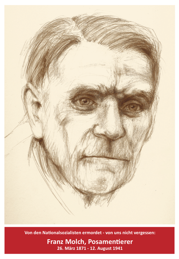 Ab 1934, dreiundsechzigjährig, bezieht Franz Molch Wohlfahrtsunterstützung: 8,50 RM wöchentlich. „Vermittlung in Arbeit scheint des Alters wegen aussichtslos“, schätzt das Wohlfahrtsamt die Situation ein. Als ihm ohne Begründung und ohne Nachweis die Rente gekürzt wird, fürchtet er um seine Existenz. „Er hat Beschwerde erhoben gegen einen mit dem Hakenkreuz, weil er ihm 3 Wochen hintereinander 50 Pfg von der Rente abgezogen hat“, notieren die Beamten. „Das schlimmste bei dem Molch ist zunächst sein ungebührliches Verhalten, das geeignet ist, in den Räumen des Wohlfahrtsamtes Beunruhigung hervorzurufen. Man kann nicht einfach darüber hinweggehen, wenn jemand in den Amtsräumen brüllt. Molch hat auch, nachdem er aus dem Zimmer gewiesen wurde, noch auf dem Gang herumgeschimpft. Es mag sein, dass er nicht voll verantwortlich gemacht werden kann für seine Reden, aber das ändert nichts an der Wirkung. Auch außerhalb des Amtes wird eine solche Person nicht zurückhaltender sein, so dass erwogen werden möchte, ob die Allgemeinheit nicht vor deren Anwürfen geschützt werden kann.“ Bereits zuvor „wurde daher im Juni 1938 die polizeiliche Vorbeugehaft erwogen. Molch befand sich bereits in polizeilicher Verwahrungshaft. Bei der damaligen ärztlichen Untersuchung wurde er als nicht lager- und arbeitsfähig befunden. Seine Unterbringung ins Konzentrationslager (KL) ist abgelehnt worden.“