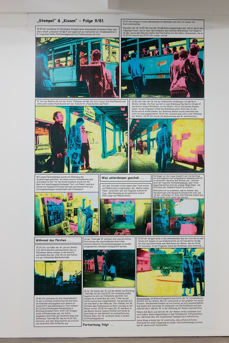 Die Versuche, „eine andere Form von Widerstand“ (Bernd Schlothauer) zu finden, reichen nämlich über ihre Zeit hinaus. Wenn Joerg Waehner seine Stasi-Akte in eine comicartige Foto-Love-Story „Stempel" und "Kissen" überführt, schließt sich der Kreis zu den aktuellen Debatten um Überwachung und Kontrolle.