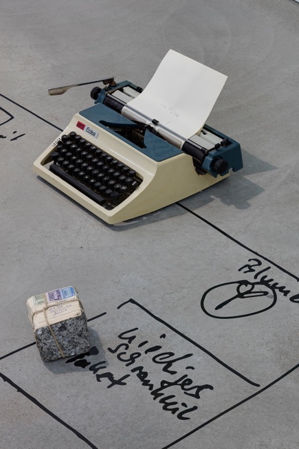 Bodenfolie mit Reiseschreibmaschine "Erika" und Pflasterstein: Wurfsendung an die politische Justiz