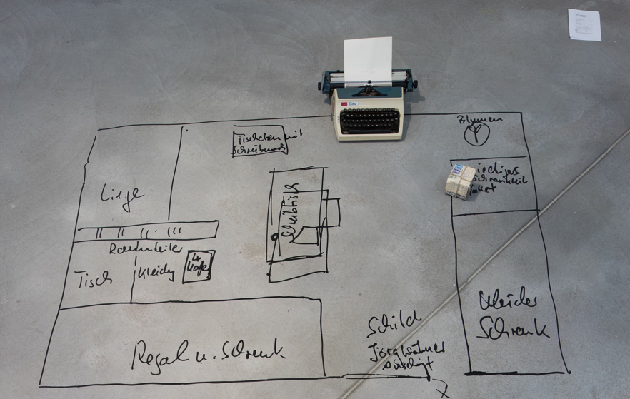 Vliestapete, Bodenfolie, Pflasterstein, Reiseschreibmaschine "Erika", 4 Türspione, Holzstele, QR-Code